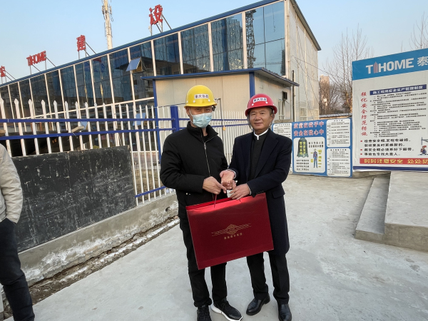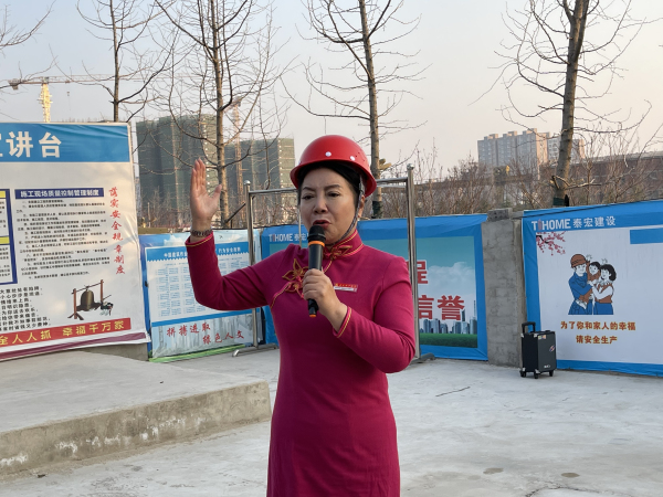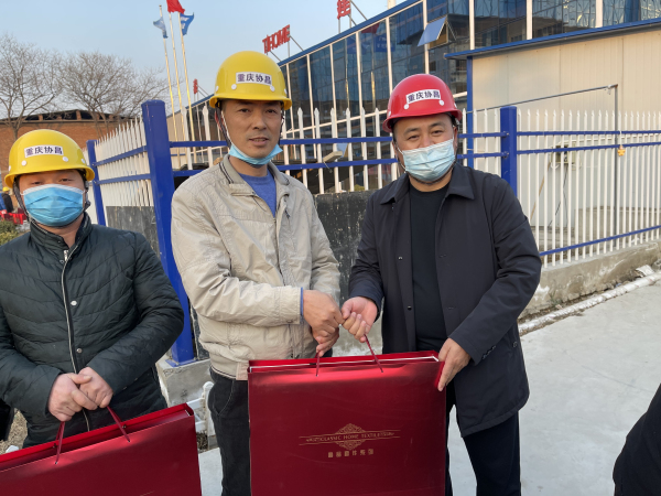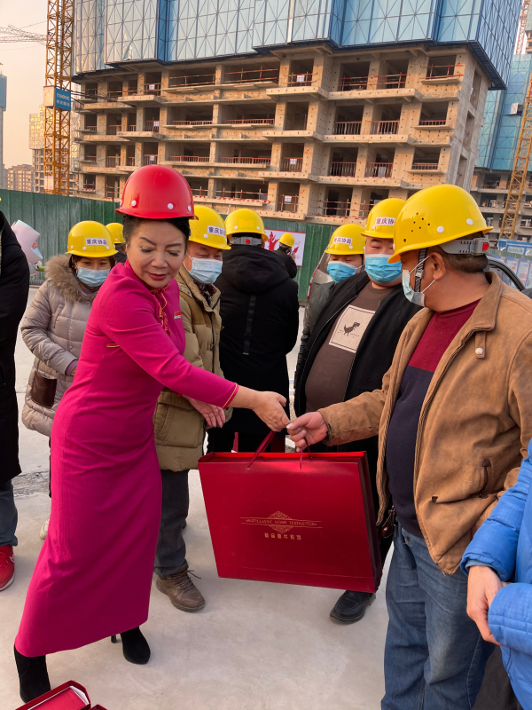 “网红薛书记”、薛荣会长来到建筑工地时,农民工代表给她献了花,大家鼓掌表示热烈欢迎。接着,薛荣会长同大家一一握手,嘘寒问暖,送给棉被御寒物品表示慰问。