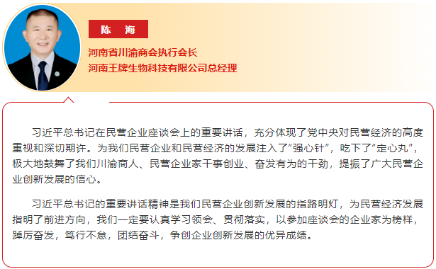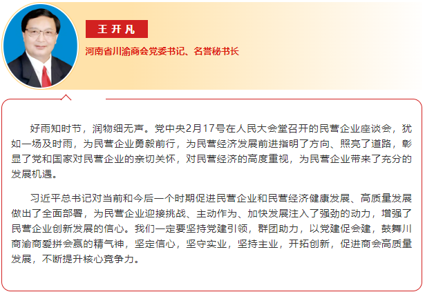 2025年2月17日,中共中央总书记、国家主席、中央军委主席习近平出席民营企业座谈会并发表了重要讲话。河南省BB贝博艾弗森官方网站通过多种形式组织学习领会习近平总书记在民营企业座谈会上的重要讲话精神。大家纷纷表示,习近平总书记的重要讲话鼓舞人心、催人奋进,充分体现了党中央对民营企业的重视和支持,激励着大家在新征程上开拓进取、再创佳绩。一定要胸怀报国志,一心谋发展,守法善经营,先富促共富,以实际行动发扬川商渝商拼搏精神,努力为以中国实现现代化全面推进强国建设、民族复兴伟业做出贡献。河南省BB贝博艾弗森官方网站秘书处将分5期报道副会长以上领导成员的学习体会。