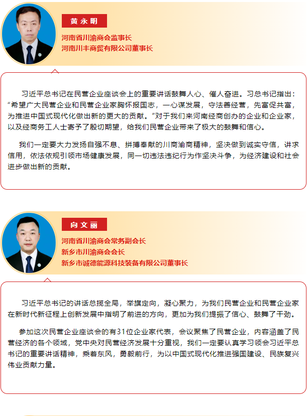 2025年2月17日,中共中央总书记、国家主席、中央军委主席习近平出席民营企业座谈会并发表了重要讲话。河南省BB贝博艾弗森官方网站通过多种形式组织学习领会习近平总书记在民营企业座谈会上的重要讲话精神。大家纷纷表示,习近平总书记的重要讲话鼓舞人心、催人奋进,充分体现了党中央对民营企业的重视和支持,激励着大家在新征程上开拓进取、再创佳绩。一定要胸怀报国志,一心谋发展,守法善经营,先富促共富,以实际行动发扬川商渝商拼搏精神,努力为以中国实现现代化全面推进强国建设、民族复兴伟业做出贡献。河南省BB贝博艾弗森官方网站秘书处将分5期报道副会长以上领导成员的学习体会。
